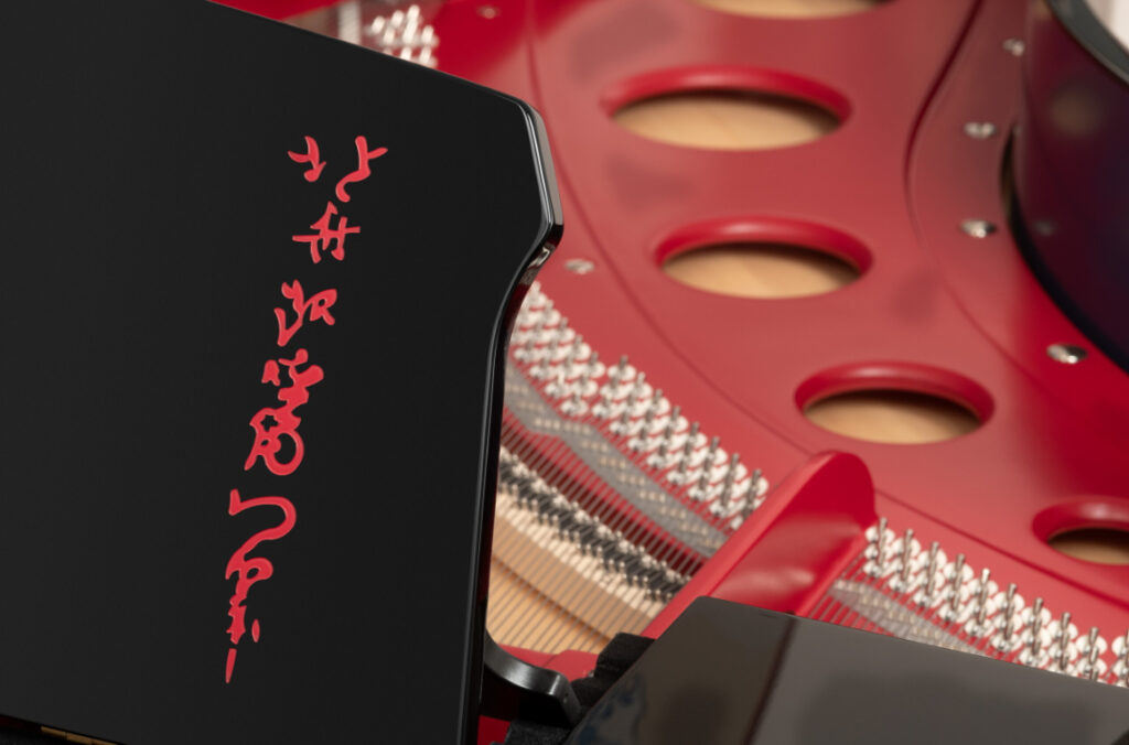 The red of the cast iron frame and Hokusai’s signature on the music stand reflect the particular significance of the colour red in Japanese culture. Red symbolises the sun and is also seen as the colour of protection. It is often used for traditional Japanese gates, known as torii, to ensure the flow of positive energy. The torii, which consist of two posts and a double crossbar, stand in front of shrines and temples to represent the transition from the everyday to the spiritual world.